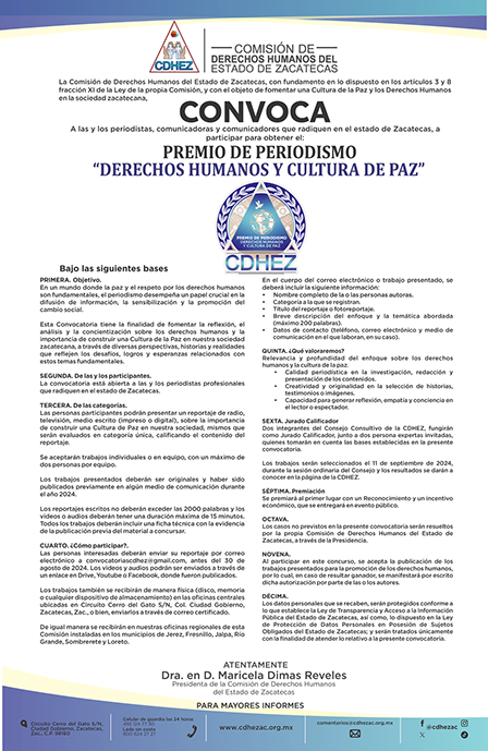 Con la finalidad de promover la paz y el respeto a los derechos fundamentales, la Comisión de Derechos Humanos del Estado de Zacatecas (CDHEZ), invita a las y los periodistas, comunicadoras y comunicadores que radiquen en el estado de Zacatecas, a participar para obtener el Premio de Periodismo “Derechos Humanos y Cultura de Paz”.