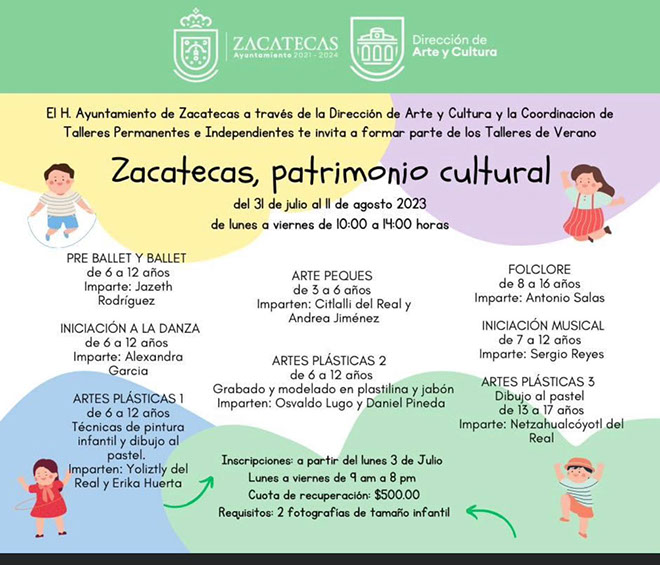 El Ayuntamiento de la Capital, a través de la Dirección de Arte y Cultura, invita a los cursos artísticos y culturales de verano de la Casa Municipal de Cultura de Zacatecas.