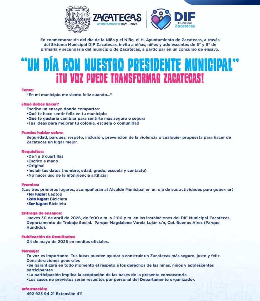 El certamen promueve el pensamiento crítico y el liderazgo entre niñas, niños y adolescentes, quienes podrán compartir su perspectiva sobre el entorno que los rodea. Los interesados deben consultar las bases completas para cumplir con los requisitos de formato y contenido establecidos por la administración municipal.