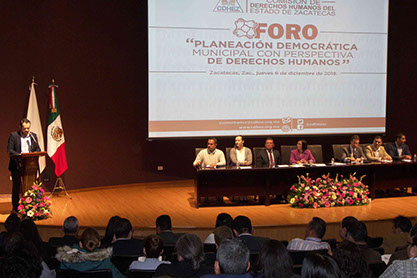 La Comisión de Derechos Humanos del Estado de Zacatecas (CDHEZ) realizó el Foro "Planeación Democrática Municipal con Perspectiva de Derechos Humanos", con el objetivo de brindarles información, conocimientos y herramientas sobre el proceso de planeación, presupuestación y actuación con enfoque de derechos humanos, que favorezcan el cumplimiento de las atribuciones y funciones de las autoridades municipales, mismas que deben estar siempre apegadas a la legalidad y con pleno respeto a los derechos humanos de las y los ciudadanos.